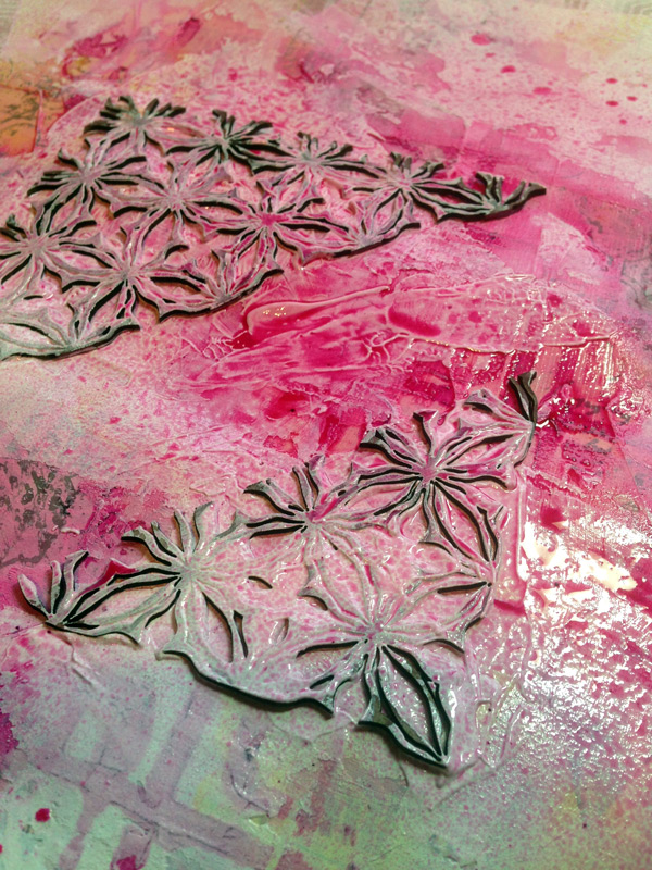 I started gessoing the chipboards. Here you see the Rose Vine border.
