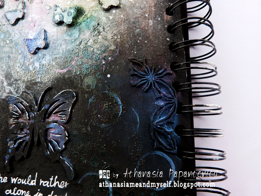 For the big butterfly I used irridescent silks to color it. They really make the perfect paint for black surface. I also used a White UniBall pen to make some doodling on it and also write the quote.