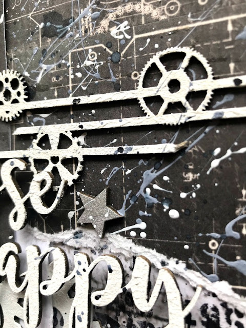 The Giant gear/cogs has a couple of coats of white Acrylic paint & I have cut this large gear in half & have half peeking out under the corner of my photo & the other half peeking out from underneath a paper layer...